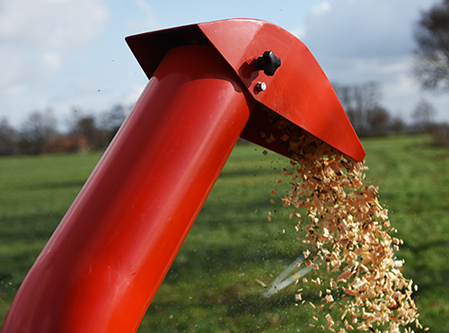De houtsnippers worden hoog uitgeworpen en gaan rechtstreeks in een aanhanger of kruiwagen via de draaibare uitvoer met aanpasbare deflector. De houtversnipperaar wordt standaard geleverd met PRO messen, die dubbel zo lang meegaan als gewone messen.